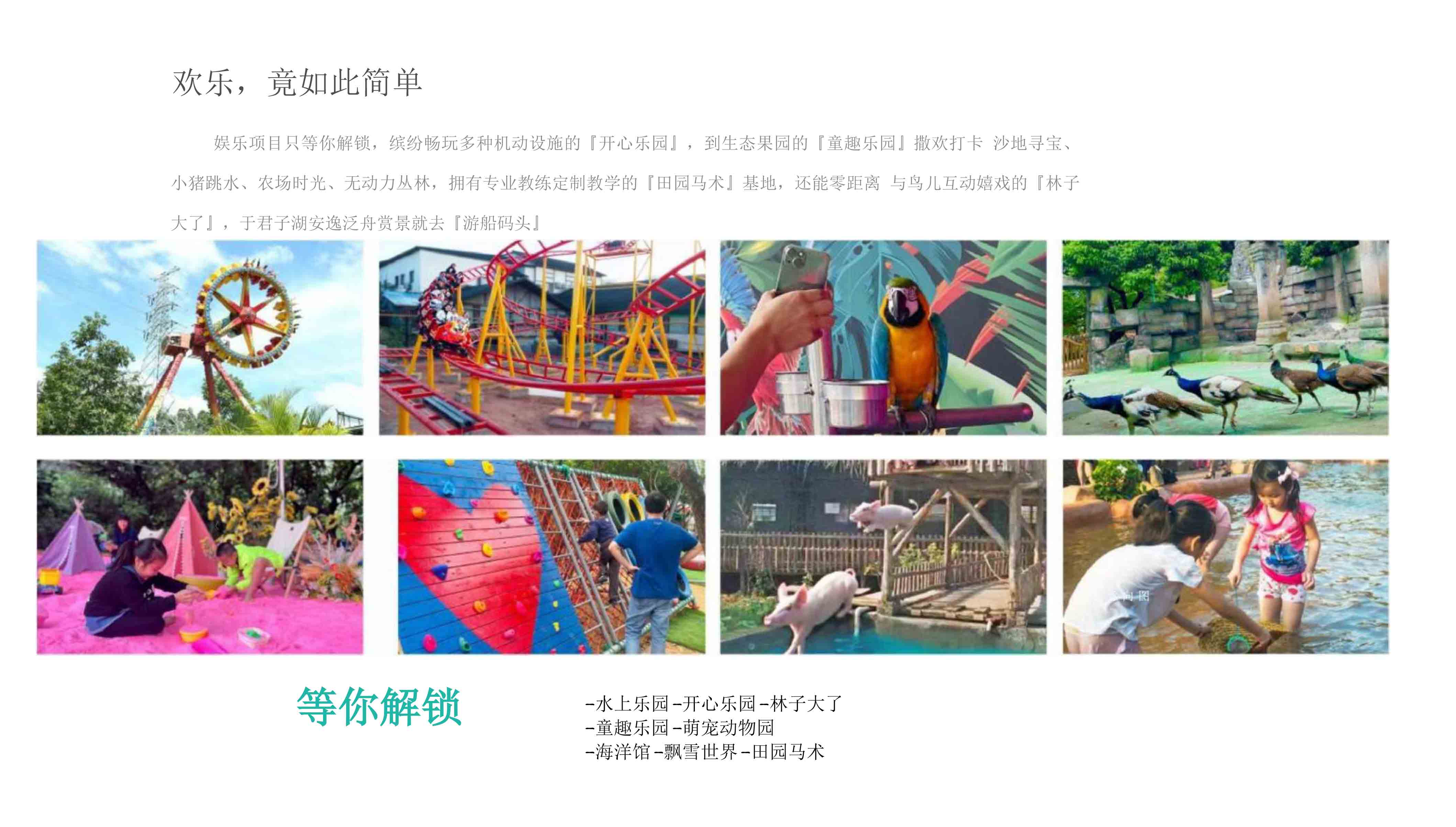 置身于开心乐园,尽情解锁各种娱乐项目,体验机动设施带来的无尽欢乐。移步童趣乐园,感受生态果园的魅力,沙地寻宝、小猪跳水、农场时光、无动力丛林,每个角落都充满童趣。在专业教练的引导下,探索田园马术基地的独特魅力,感受马术运动的激情与优雅。更有林子大了,与鸟儿亲密互动,享受大自然的宁静与和谐。漫步君子湖畔,游船码头等您来泛舟赏景,感受湖水的宁静与美景的醉人。